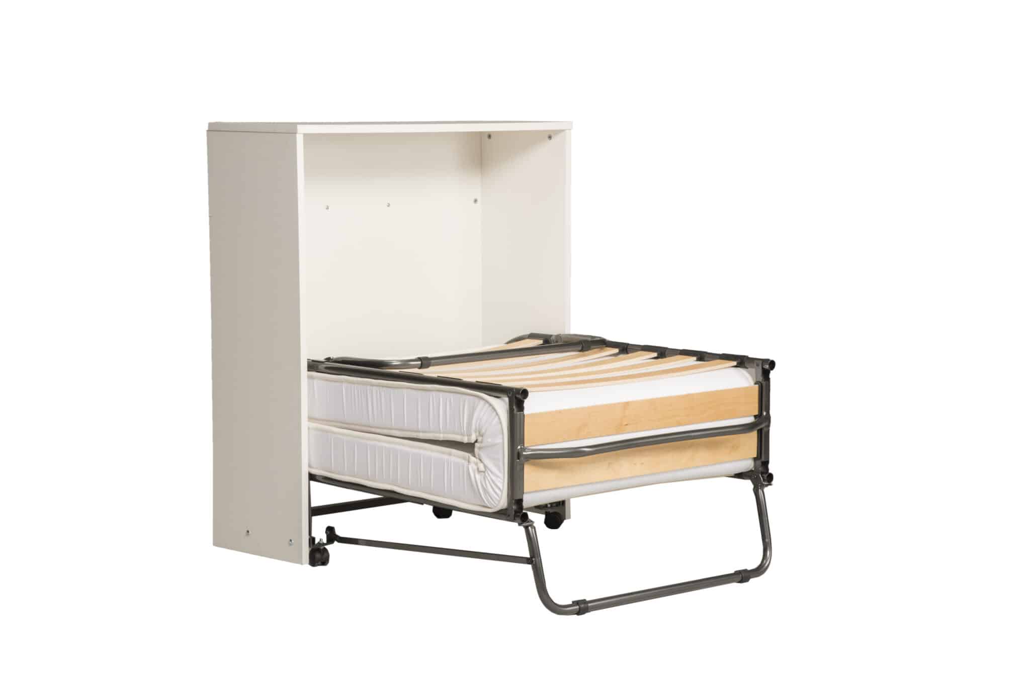 Nuestra cama plegable está construida con materiales resistentes que garantizan su durabilidad. La estructura metálica del somier se diferencia de la competencia. Los acabados  de madera, no solo se adaptan a todos los estilos, sino que también aseguran una larga vida útil del mueble.