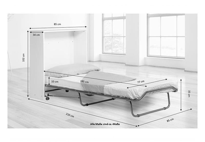 Las medidas del Mueble son 85cm de ancho, 102cm de alto y 34cm de fondo, que se convierte en 210cm con la cama extendida. La altura desde el suelo hasta la parte superior del colchón es de 35cm.